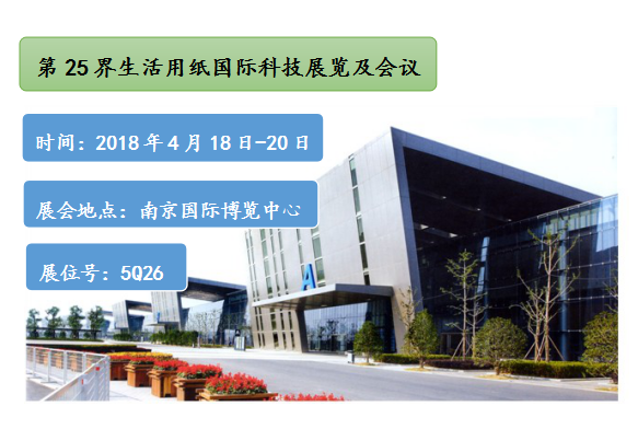 第二十五界生活用纸国际展览及会议(2018年生活用纸年会暨妇婴童、老人卫生用品展会)将于2018年4月18日-20日在南京国际博览中心盛大召开。